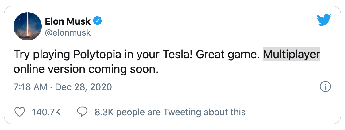 엘론머스크의 테슬라는 역시나 이러한 트렌드의 변화를 잘 캐치하고 있는 듯 합니다. 지난 크리스마스, 미국 테슬라에서 소프트웨어 업데이트를 했습니다. 이제 테슬라 자동차 안에서도 게임을 즐길 수 있게 되었다고 합니다. 지난해부터 테슬라는 내부 화면을 통해 게임을 즐길 수 있는 기능을 준비해 왔다는 사실 아시나요? 또한 2020.12.28 엘론머스크는 트위터 계정에 폴리토피아 Polytopia라는 멀티플레이어 온라인 게임의 커밍순을 기약하기도 했습니다.