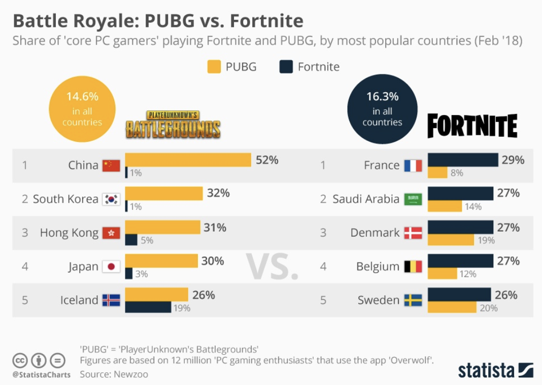 배틀 그라운드와 비교했을 때 다음과 같은 차이를 보이고 있습니다. 배틀그라운드는 중국-한국-홍콩-일본-아이슬란드 순으로 플레이되고 있고, 포트나이트는 프랑스-사우디 아라비아-덴마크-벨기에-스웨덴 순으로 유럽국가와 사우디를 중심으로 플레이되고 있습니다.