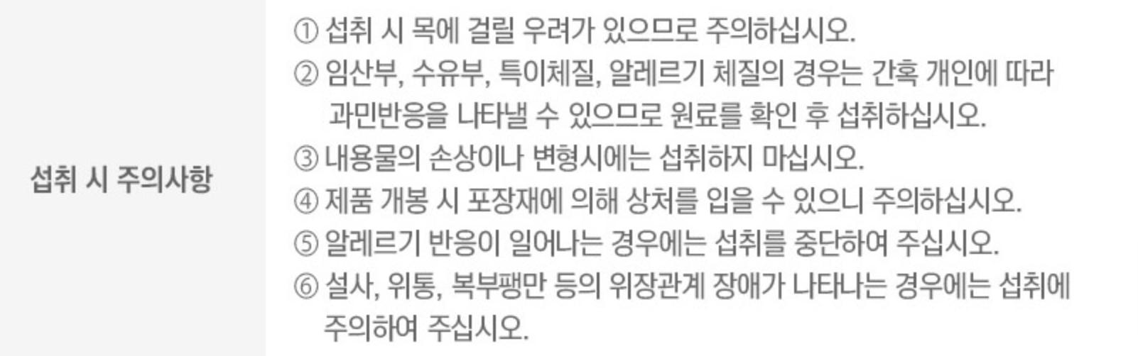 | 1. 알레르기 반응이 나타나는 경우에는 섭취 중단 | 1. 어린이, 임산부 및 수유부는 섭취를 피할 것 [🌟추가] |