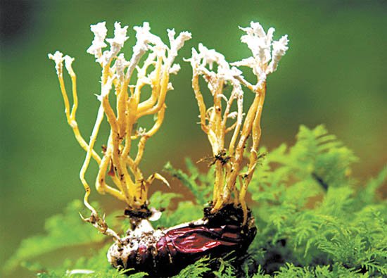 겨울에는 곤충의 몸속에 씨앗 형태로 있다가 여름에 버섯으로 자라는 약초입니다.