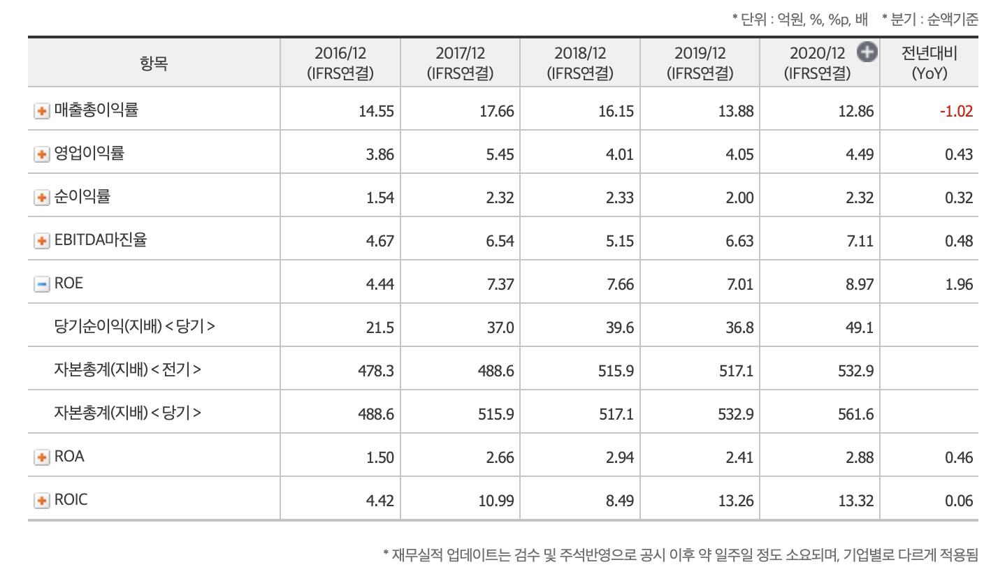 매출총이익률/ 영업이익률/ 순이익률/ EBITDA마진율/ ROE