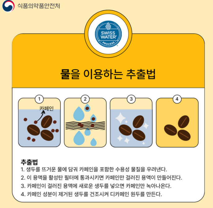 | 물 추출법 (스위스 워터 프로세스) | 생두를 물에 담가 카페인과 성분을 녹여낸 뒤, 활성탄 필터로 카페인만 제거 후 성분을 재흡수. | 장점: 화학물질 미사용, 안전. 단점: 커피 향과 맛이 일부 손실 가능. |