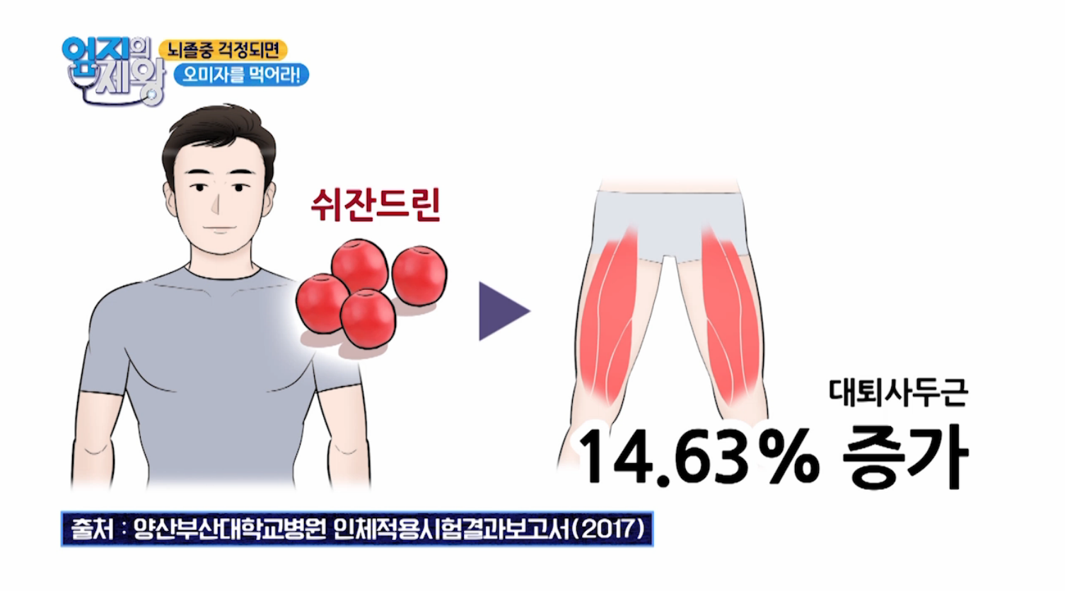 오미자를 꾸준히 섭취하면 허벅지 근력에 있어서 10년이 젊어질 수 있다는 이야기입니다.