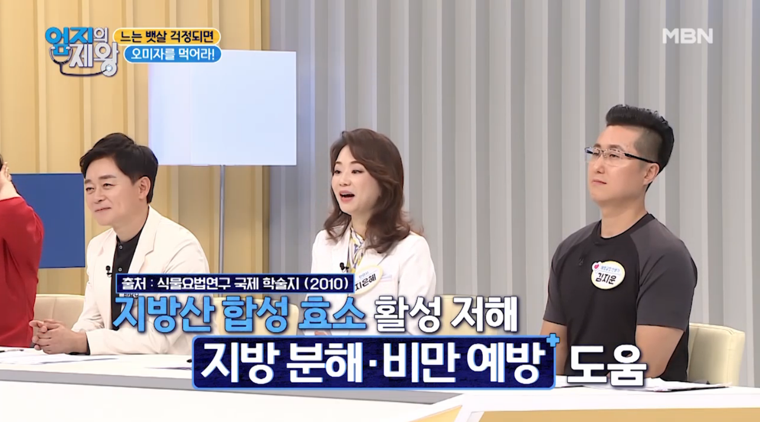 이 날은 재활의학과 전문의 유재욱님, 의학박사 서재걸님, 한의사 지은혜님이 나오셔서 오미자가 뇌졸중 예방, 느는 뱃살 예방에 좋은 점에 대해서 설명을 해주셨습니다.
