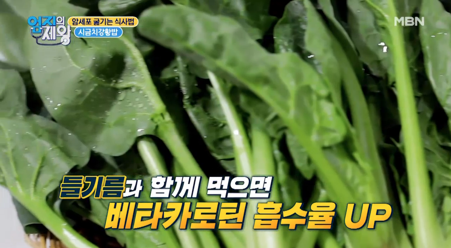 시금치에 함유된 항산화 성분인 베타카로틴이 지용성이기 때문에, 들기름과 함께 섭취시 섭취율이 올라갑니다.