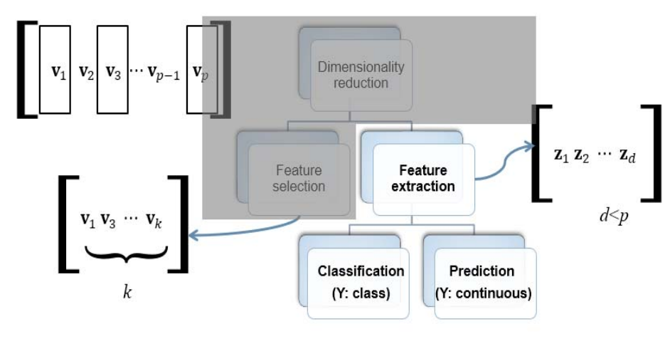 Feature extraction: 엑기스를 뽑아낸다는 개념. 대표적인 것이 PCA인데, 변환을 통해 저차원으로 표현해내는 것입니다. 공분산을 잘 설명해주는 새로운 트랜스포메이션으로 표현하는 것입니다.