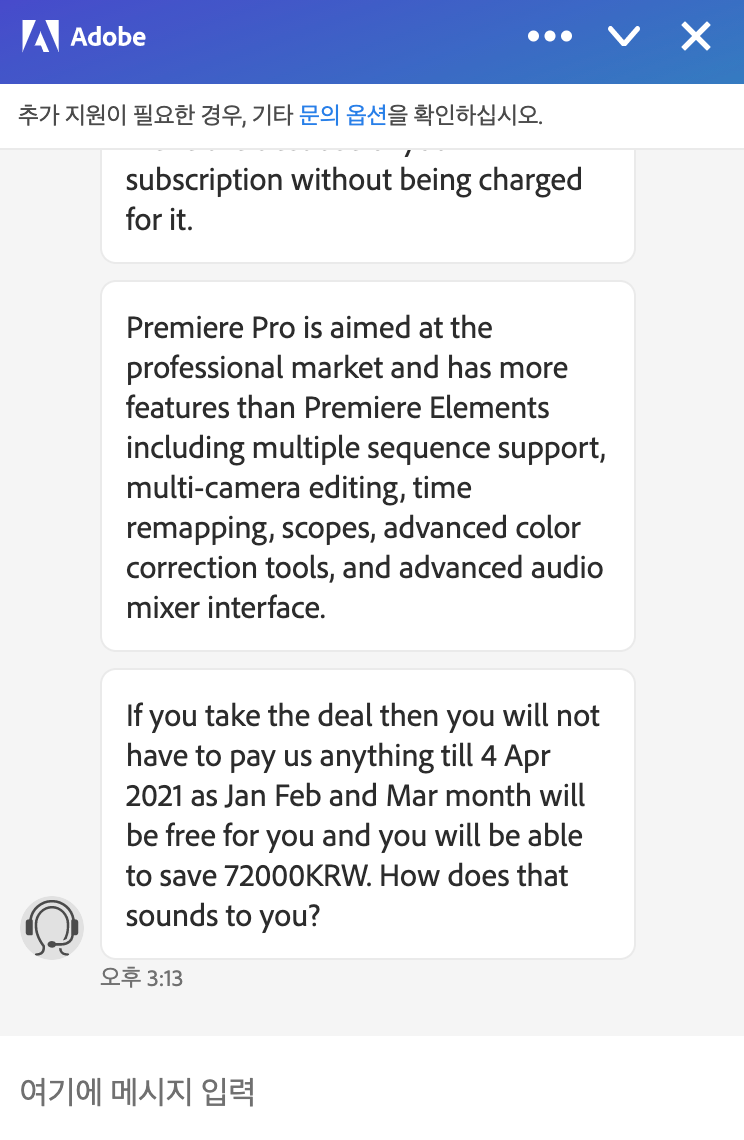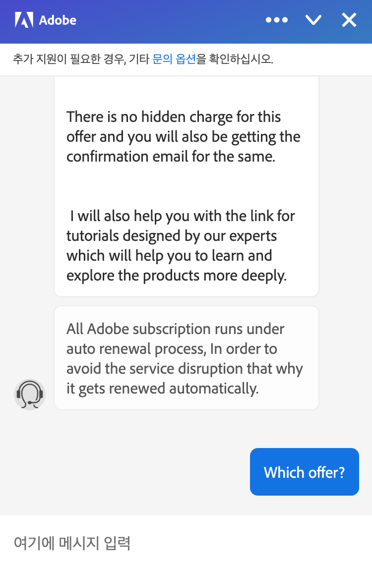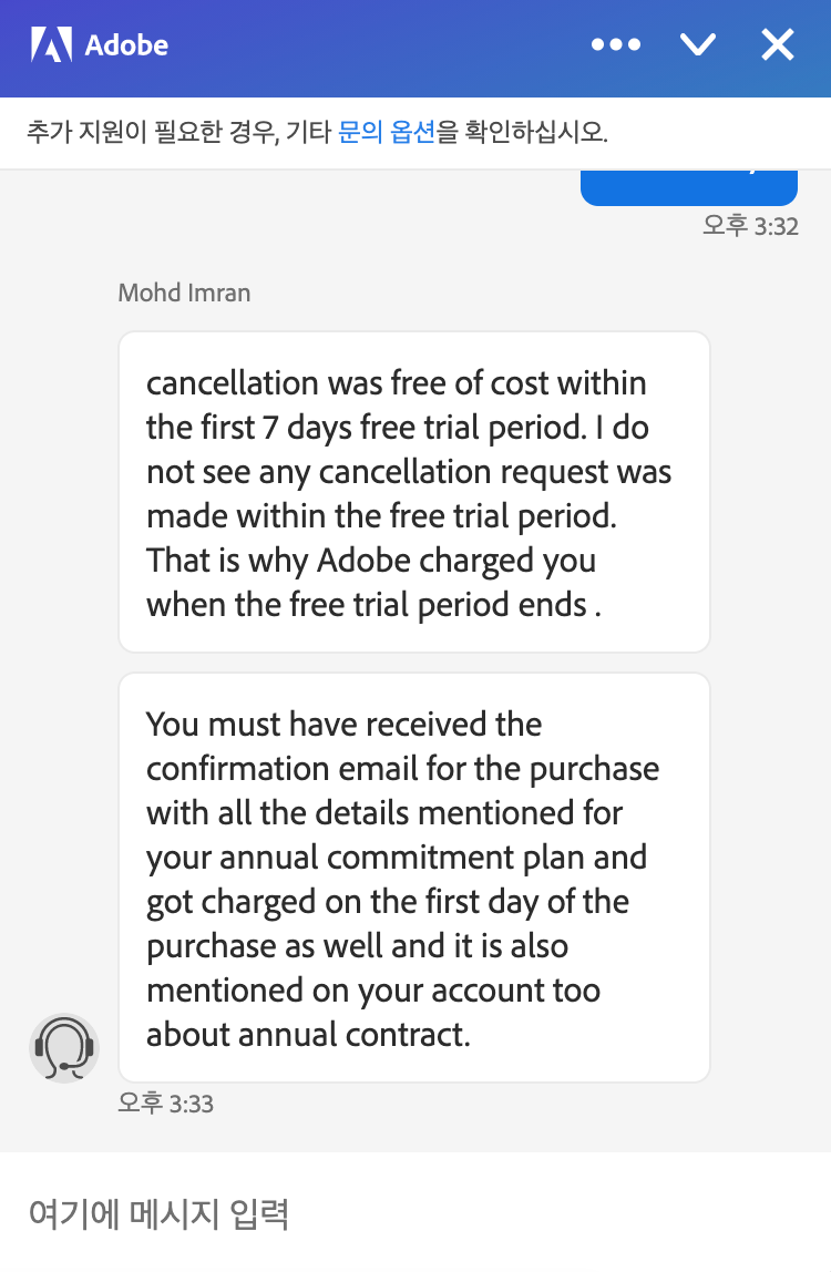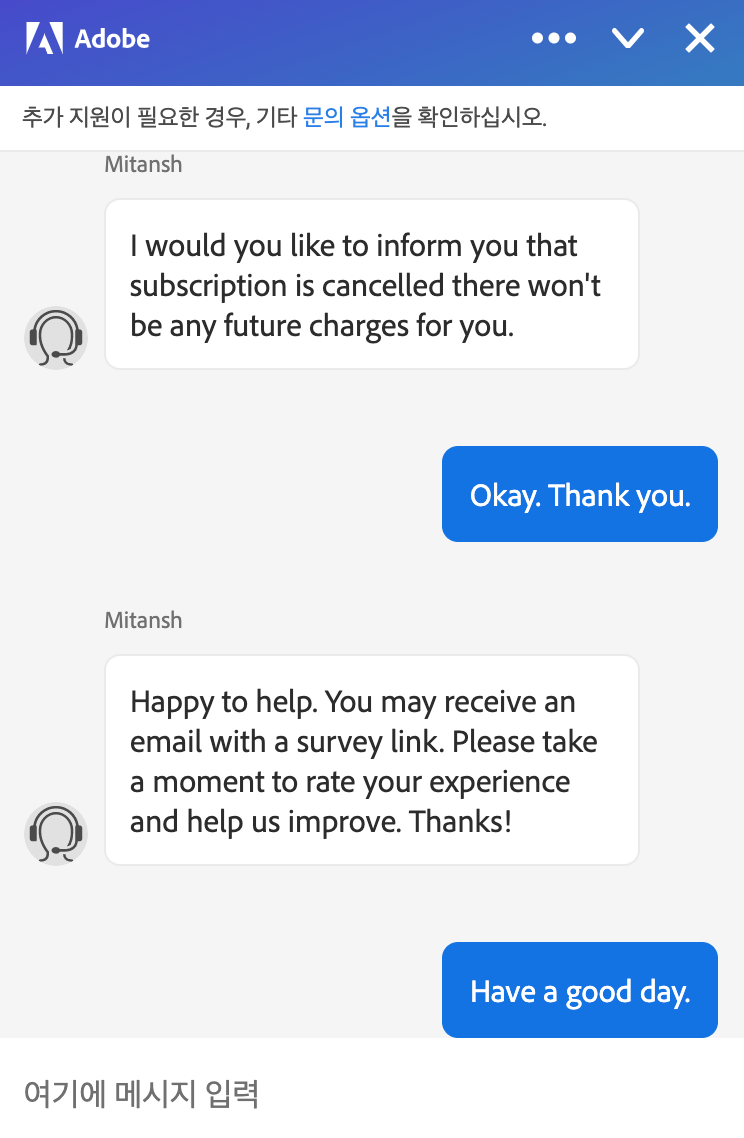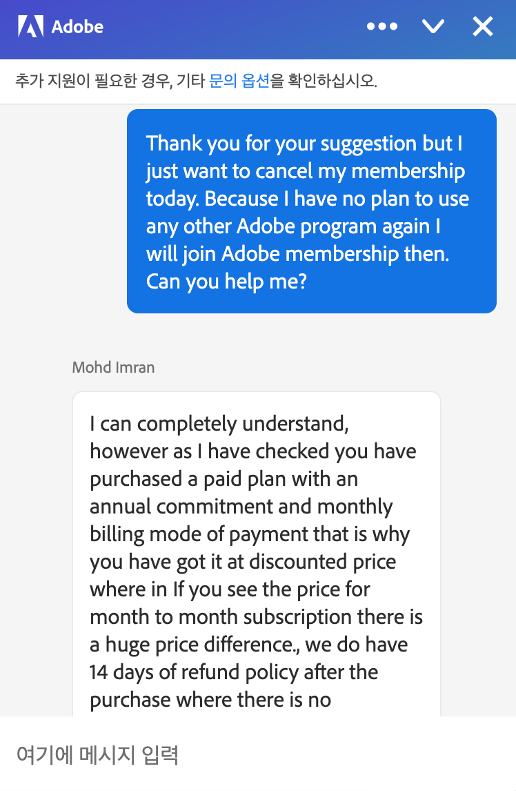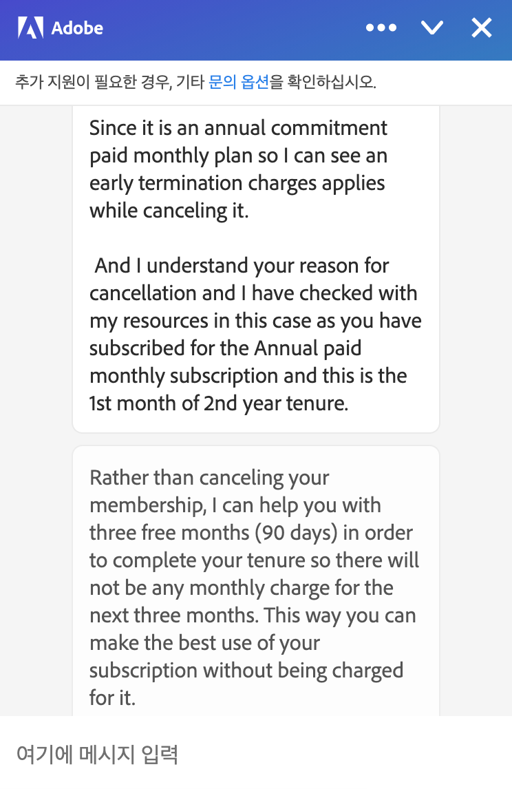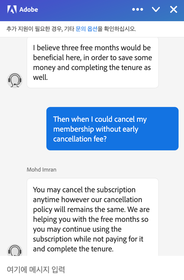 그런데 이 중에서 1, 2번은 수수료를 지급해야 한다는 결론을 낼 확률이 높고, 3번 방법이 가장 성공 케이스가 많았습니다. 아무래도 어도비 본사에서 예산 등을 관리하다보니 한국 지사에서 관할하기 힘든 부분이 있지 않을까 생각합니다. 그래서 저도 3번 방법 [어도비 미국 직원 채팅 상담]으로 시도했고, 조기 취소 수수료 없이 바로 결제 취소 성공했습니다.
