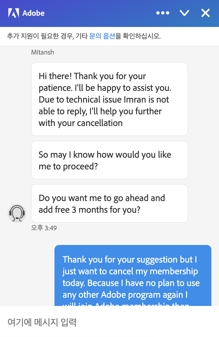 그렇게 새로운 상담 직원분이 배정되고는 3개월 무료 제안을 하겠느냐고 질문 받았습니다. 그래서 한번 더 위에서 했던 답변대로 "제안은 고맙지만, 오늘 멤버십을 취소하고 싶다. 도와줄 수 있는지?"라고 회신했습니다.